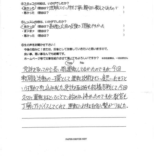 免許を取ってから、長い間運転してなかったのですが、 今回就職活動の一環として運転技術をもう一度思い出そうという理由で申し込みました。 免許を取る時も結構苦戦して、今回久々に運転するということで、 始めは怖かったのですが、教官も丁寧にアドバイスしてくれて、運転に対する自信に繋がりました。
