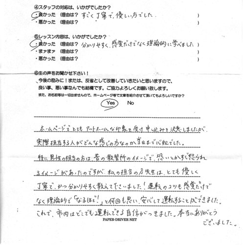 ホームページでとてもアットホームな印象を受け申し込みを決意しましたが、 実際担当する人がどんな感じの方なのか当日まで心配でした。 特に男性の担当の方は、昔の教習所のイメージで、 恐いとか、すぐ怒られるイメージがあったのですが、私の担当の先生は、とても優しく 丁寧で、かつ分かりやすく教えて下さいました!安心して運転することができました。 これで、市内はどこでも運転出来る自信がつきました。 本当にありがとうございました。