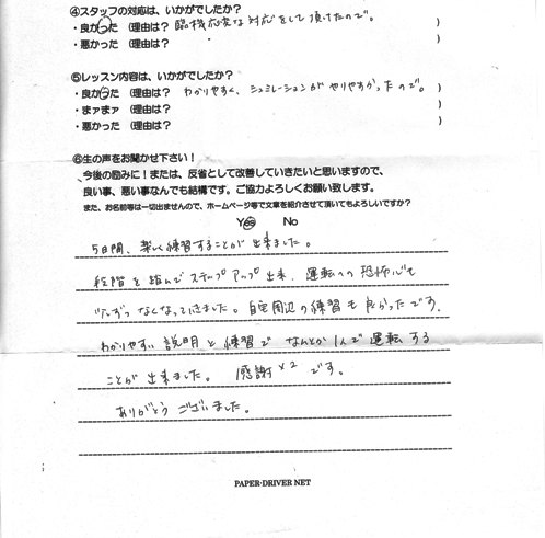 5日間、楽しく練習することが出来ました。 段階を踏んでステップアップ出来、運転への恐怖心を少しずつなくなっていきました。 自宅周辺の練習も良かったです。 わかりやすい説明と練習で、なんとか1人で運転することが出来ました。 感謝×2です。 ありがとうございました。