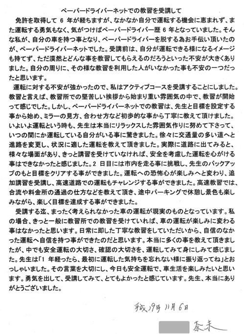 免許を取得して6年が経ちますが、なかなか自分で運転する機会に恵まれず、また運転する勇気もなく気がつけばペーパードライバー歴6年となっていました。そんな私が、自分の車を持つ事となり、ペーパードライバーを脱出する為、お手伝い頂いたのが、ペーパードライバーネットでした。 受講前は、自分が運転できる様になるイメージも持てず、ただ漠然とどんな事を教習してもらえるのだろうといった不安が大きくありました。自分の周りに、その様な教習を利用した人がいなかった事も不安の一つだったと思います。運転に対する不安が強かったので、私はアクティブコースを受講することにしました。 教習と言えば、教習所での堅苦しい挨拶から始まり重い雰囲気の中で、教習が開始って感じでした。しかし、ペーパードライバーネットでの教習は、先生と目標を設定する事から始め、ミラーの見方、合わせ方など初歩的な事から丁寧に教えて頂けました。いよいよ運転という時も、先生は本当にリラックスした雰囲気作りに努めて下さって、いつの間にか運転している自分がいる事に驚きました。 実際に道路に出てみると、様々な場面があり、きっと講習を受けていなければ、安全を考慮した運転を心がける事ができなかったと感じました。2日目には市内を走る事に挑戦し、先生のバックアップのもと目標をクリアする事ができました。 運転への恐怖心が楽しみへと変わり、追加講習を受講し、高速道路での運転もチャレンジする事ができました。高速教習では、合流や料金所の通過の仕方などを教えて頂き、途中のパーキングで休憩し景色も楽しみながら、楽しく目標を達成する事ができました。 受講する迄、まったく考えられなかった車の運転が現実のものとなっています。私の場合、きっと一般に教習所での教習を受けていれば、車の運転が楽しみに変わる事はなかったと思います。日常に即した丁寧な教習をしていただいたから、自信のなかった運転が自信を持つ事ができたのだと思います。本当に多くの事を教えて頂きましたが、中でも安全運転の大切さ、確認の大切さを、運転してみて身にしみて感じました。 先生は「1年経ったら、最初に運転した気持ちを忘れないように振り返ってね」っとおっしゃいました。その言葉を大切にし、今日も安全運転で、車生活を楽しみたいと思います。勇気を出して、受講してみて、とてもよかったと感じています。先生、本当にありがとうございました。