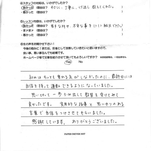初めはちっとも乗れる気がしなかったのに、最終日には自信を持って運転できるようになっていました。 思い切って一歩ふみ出して教習を受けてみて良かったです。 実用的な指導と思いやりのある言葉で自信をつけさせてもらいました。 感謝しています。ありがとうございました。