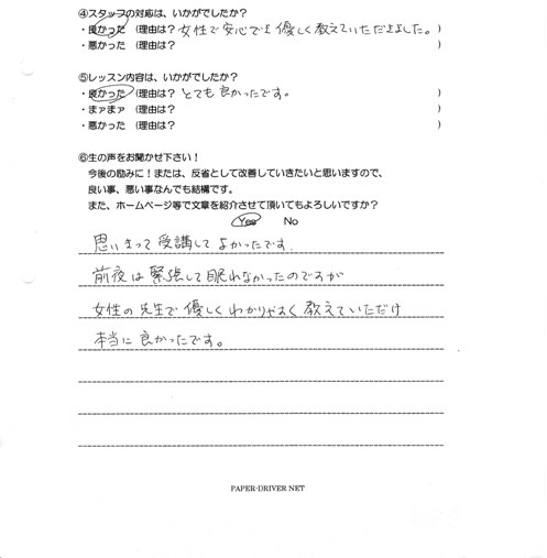 前夜は緊張して眠れなかったのですが スタッフの対応はいかがでしたか?良かった。女性で安心でき優しく教えていただきました。 レッスン内容はいかがでしたか?良かった。とても良かったです。 生の声を聞かせて下さい。今後の励みに!または、反省として改善していきたいと思いますので、良い事、悪い事なんでも結構です。思いきって受講してよかったです。 前夜は緊張して眠れなかったのですが、 女性の先生で優しくわかりやすく教えていただけ本当に良かったです。 自筆アンケート画像 コースを選択 お問い合わせ お申し込み