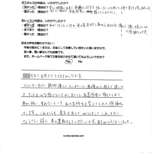先生と出会えて、とてもよかったです。 どんくさい私に親切に優しくていねいに基礎から教えて頂いて 又、アットホームな感じというか、気さくに友達感覚に接してくれて 車が恐い、乗れないという私の気持ちを変えてくれて感謝し ています。これからも勇気を出してがんばって、これっきりに ならない様に、車の運転をしていきたいです。ありがとうございました。