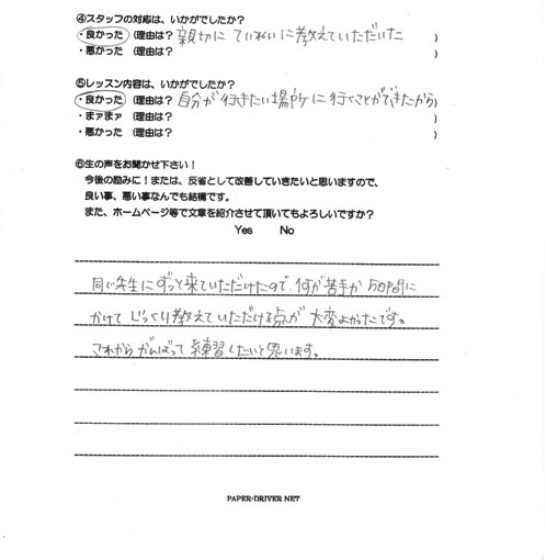同じ先生にずっと来ていただけたので、 スタッフの対応はいかがでしたか?良かった。親切にていねいに教えていただいた。 レッスン内容はいかがでしたか?良かった。自分が行きたい場所に行くことができたから 生の声を聞かせて下さい。今後の励みに!または、反省として改善していきたいと思いますので、良い事、悪い事なんでも結構です。同じ先生にずっと来ていただけたので、何が苦手か5日間に かけてじっくり教えていただける点が大変よかったです。 これからがんばって練習したいと思います。 自筆アンケート画像 コースを選択 お問い合わせ お申し込み