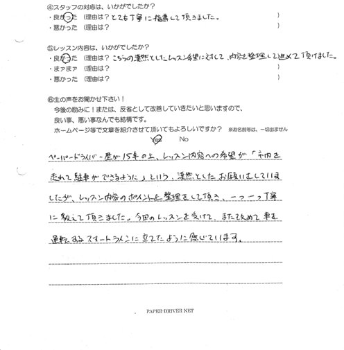 ペーパードライバー歴が15年の上、レッスン内容への希望が『市内を走れて駐車ができるように』という 漠然としたお願いをしてしまいましたが、レッスン内容のポイントを整理して頂き、一つ一つ丁寧に教えて頂きました。 今回のレッスンを受けて、また改めて車を運転するスタートラインに立てたように感じています。