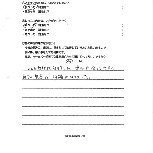 自分の欠点が明確になりました。 スタッフの対応はいかがでしたか?良かった。未記入 レッスン内容はいかがでしたか?良かった。未記入 生の声を聞かせて下さい。今後の励みに!または、反省として改善していきたいと思いますので、良い事、悪い事なんでも結構です。とても勉強になりました。 説明が分かりやすく自分の欠点が明確になりました。 自筆アンケート画像 コースを選択 お問い合わせ お申し込み