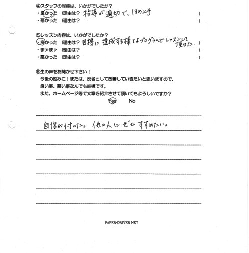 他の人に是非勧めたい。 スタッフの対応はいかがでしたか?良かった。指導が適切で、ほめ上手。 レッスン内容はいかがでしたか?良かった。目標を達成するようなプログラムでレッスンして頂けた。 生の声を聞かせて下さい。今後の励みに!または、反省として改善していきたいと思いますので、良い事、悪い事なんでも結構です。自信が付いた。 他の人に是非勧めたい。 自筆アンケート画像 コースを選択 お問い合わせ お申し込み