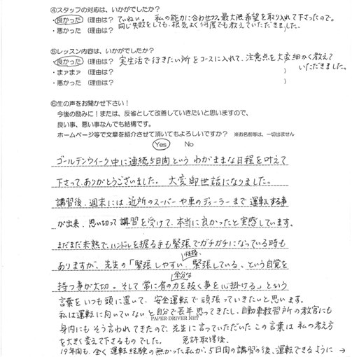 ゴールデンウイーク中に連続5日間という わがままな日程を叶えて下さってありがとうございました。 大変お世話になりました。講習後、週末には近所のスーパーや車のディーラーまで運転することが出来、思い切って 講習を受けて本当に良かったと実感しています。まだまだ未熟でハンドルを握る手も緊張でガチガチになっている時もありますが、 先生の『緊張しやすい性格、緊張しているという自覚を持つことが大切、そして常に肩の余分な力を抜く事を心掛ける』という言葉を いつも頭において、安全運転で頑張っていきたいと思います。私は運転に向いていないと自分で長年思ってきたし、自動車教習所の教官にも 身内にもそう言われてきたので、先生に言っていただいたこの言葉は、私の考え方を大きく変えて下さるものでした。 免許取得後、19年間も全く運転経験の無かった私が5日間の講習の後、運転できるようになれてのは、自家用車での出張教習だったからこそだと思います。 本当にありがとうございました。