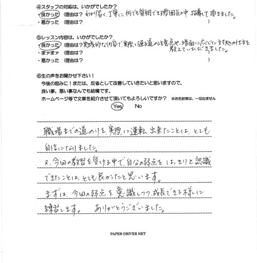 職場までの道のりを実際に運転出来たことは、とても自信になりました。 又、今回の教習を受ける中で、自分の弱点をはっきりと認識できたことは、とても良かったと思います。 まずは、今回の弱点を意識しつつ成長できる様に練習します。ありがとうございました。