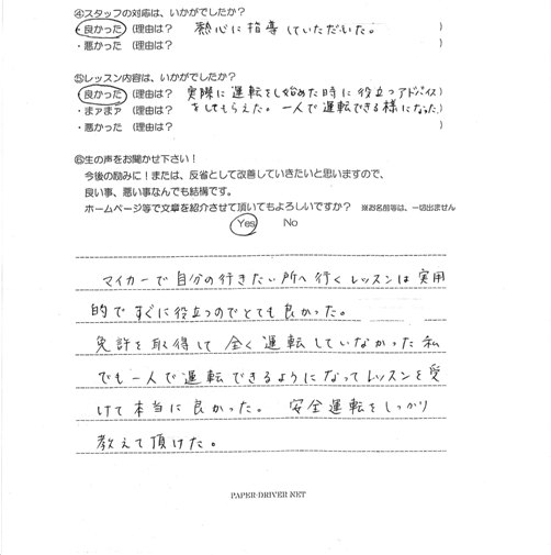 マイカーで自分の行きたい所へ行くレッスンは実用的ですぐに役立つので、とても良かった。 免許を取得して全く運転していなかった私でも一人で運転できるようになって レッスンを受けて本当に良かった。 安全運転をしっかり教えて頂けた。