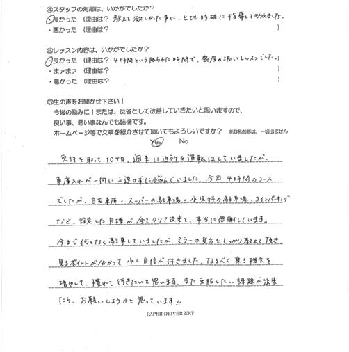 免許を取って10ヶ月、週末に近所を運転はしていましたが、車庫入れが一向に上達せずに悩んでいました。 今回4時間のコースでしたが、自宅車庫・スーパーの駐車場・小児科の駐車場・コインパーキングなど 設定した目標が全てクリア出来て、本当に感謝しています。 今まで何となく駐車していましたが、ミラーの見方をしっかり教えて頂き 見るポイントが分かって少し自信が付きました。 なるべく乗る機会を増やして慣れて行きたいと思います。 また克服したい課題が出来たら、お願いしようかと思っています!!