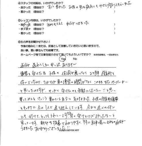 返信が遅れて申し訳ありません。 講習を受けた後、子供の体調が悪くなり2ヶ月半保育所を休んでいたので、 なかなか車の練習の時間がなく、このまま またペーパーか・・・と思ったのですが、 せっかく受けたのを無駄にしたくない!! と思い乗ってみると けっこう乗れている自分に気付きました。 子供の保育所復帰をキッカケに今は1人で送り迎えしています。今日は、近くのイオンにも行けて、とってもうれしいです。 もっと早く受けとけば、よかったな〜と思っています。 親切な指導でわかりやすく、特に駐車場に止める自信がつきました。 ありがとうございました!!